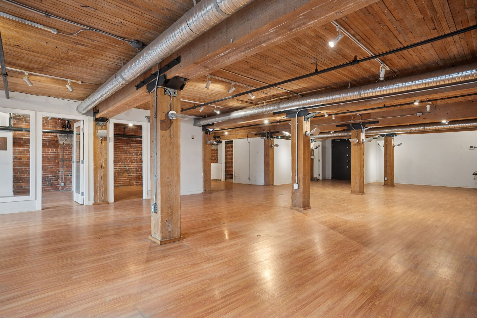 An open layout with brick accents provides a clean, adaptable canvas for workspace or creative use.